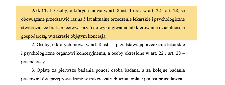 Nieco parafrazując: Wraz z wnioskiem, o którym mowa na wstępie, przedsiębiorca przedkłada orzeczenia lekarskie i psychologiczne, stwierdzające brak przeciwwskazań do kierowania działalnością objętą zakresem koncesji oraz dokumenty potwierdzające wykształcenie co najmniej średnie i przygotowanie zawodowe do kierowania działalnością określoną w koncesji