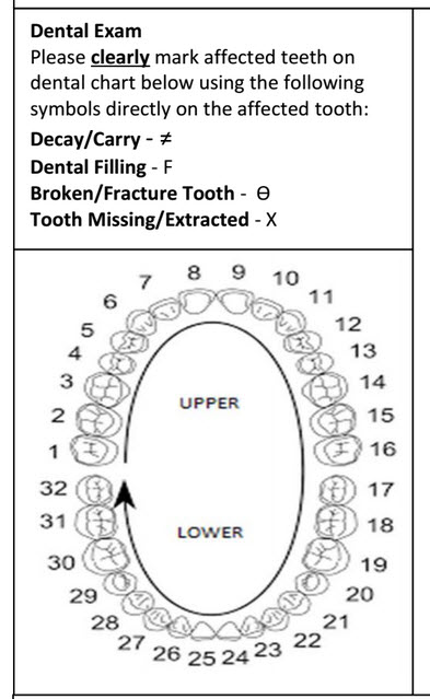 Ponadto dochodzi konieczność okazania wyniku badania stomatologicznego (dental exam) według wzoru załączonego poniżej.