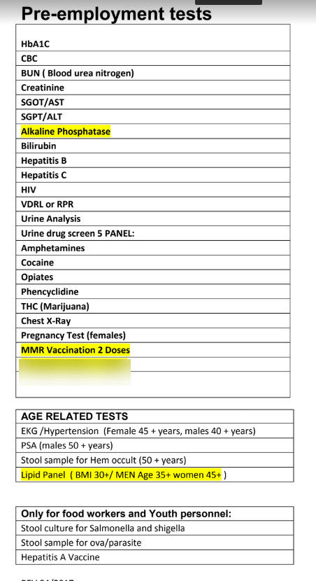 Początkiem roku 2017 linie Carnival z Miami USA zmieniły zasady przeprowadzania badań przed pracą na swoich statkach wycieczkowych. Generalnie doszedł obowiązek nowych szczepień, dokumentowania odporności na niektóre przebyte choroby, wykonania badania fosfatazy alkalicznej, panelu lipidowego dla mężczyzn i kobiet z otyłością lub nieco starszych oraz rozszerzony zakres badań lekarskich.