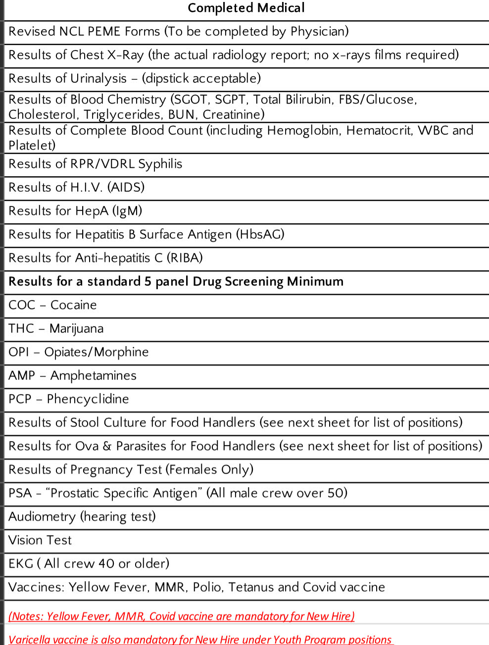 Pierwsza grupa badań Norwegian Cruise Line [Regent Seven See Cruises] obowiązkowa dla wszystkich kandydatów lub powracających do pracy.