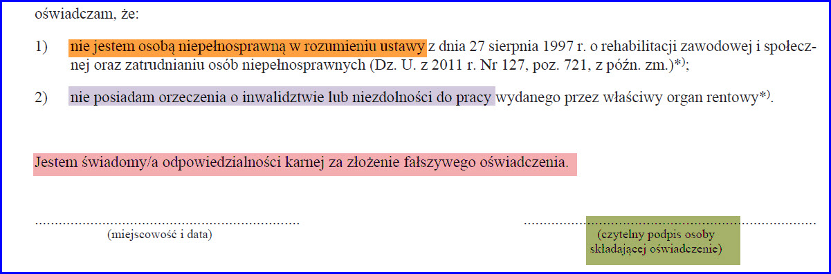 2) nie posiadasz orzeczenia o inwalidztwie lub niezdolności do pracy wydanego przez właściwy organ rentowy*). Jesteś świadomy/a odpowiedzialności karnej za złożenie fałszywego oświadczenia. Czyli po coś to oświadczenie jest potrzebne. |