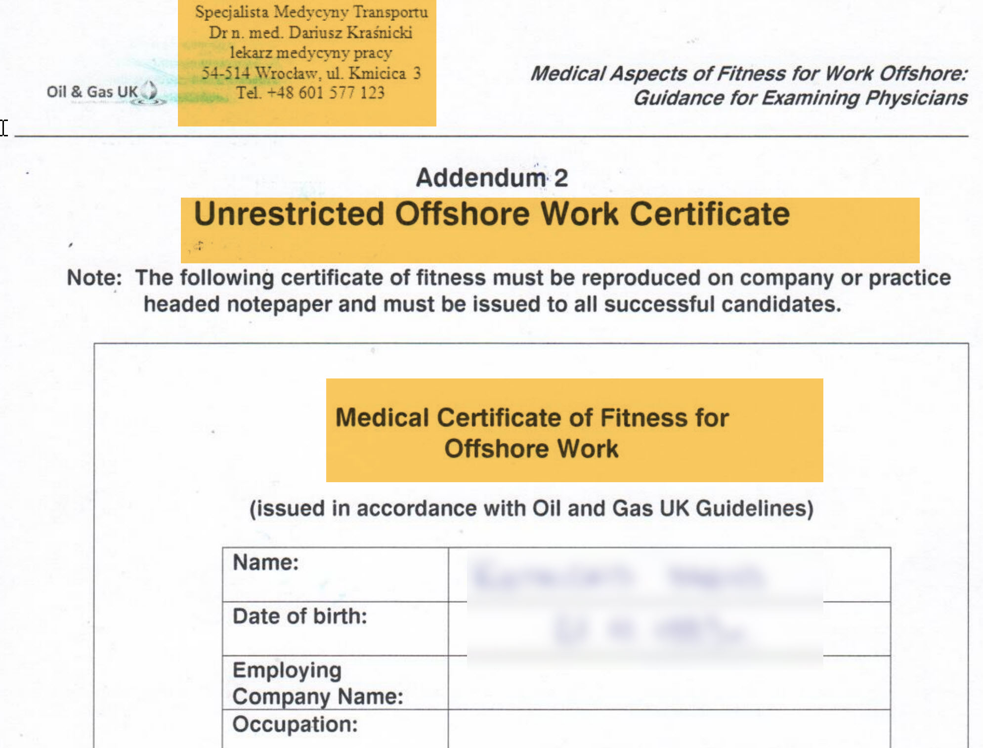 Od maja 2013 roku posiadam pełne uprawnienia do wystawiania certyfikatów zdrowia dla pracowników Offshore platform wiertniczych na Morzu Północnym, więc zapraszam serdecznie do mojej Placówki.
