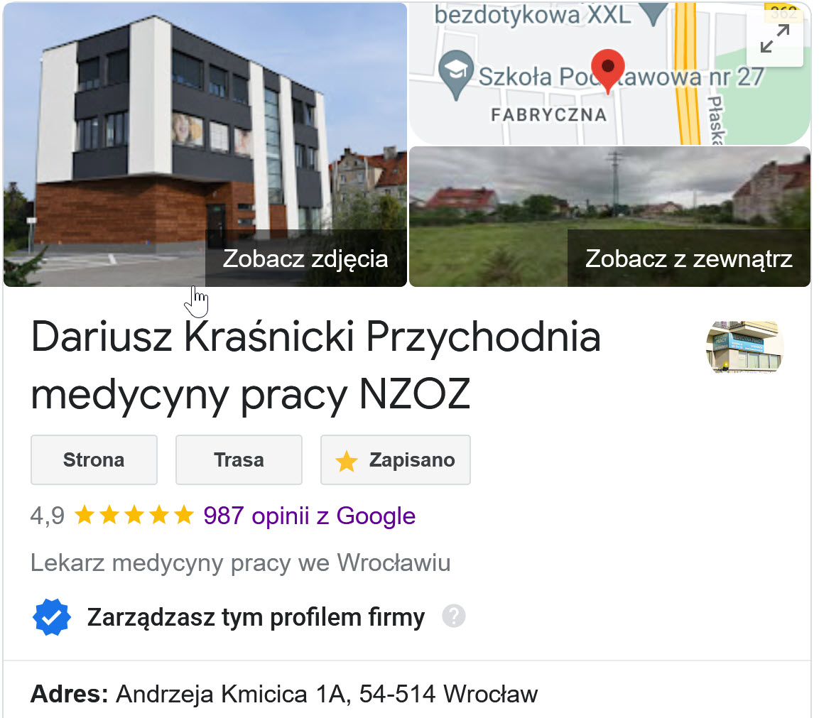 Badania pracowników przeprowadzam w mojej Placówce na ulicy Kmicica1A w zachodniej części Wrocławia (Osiedle Żerniki).